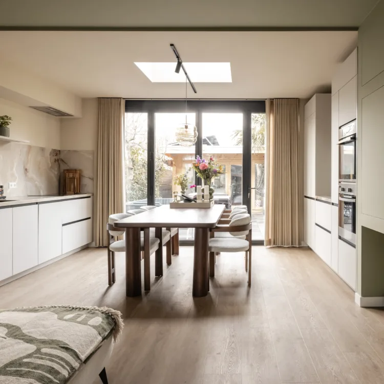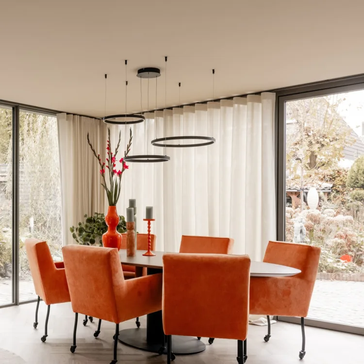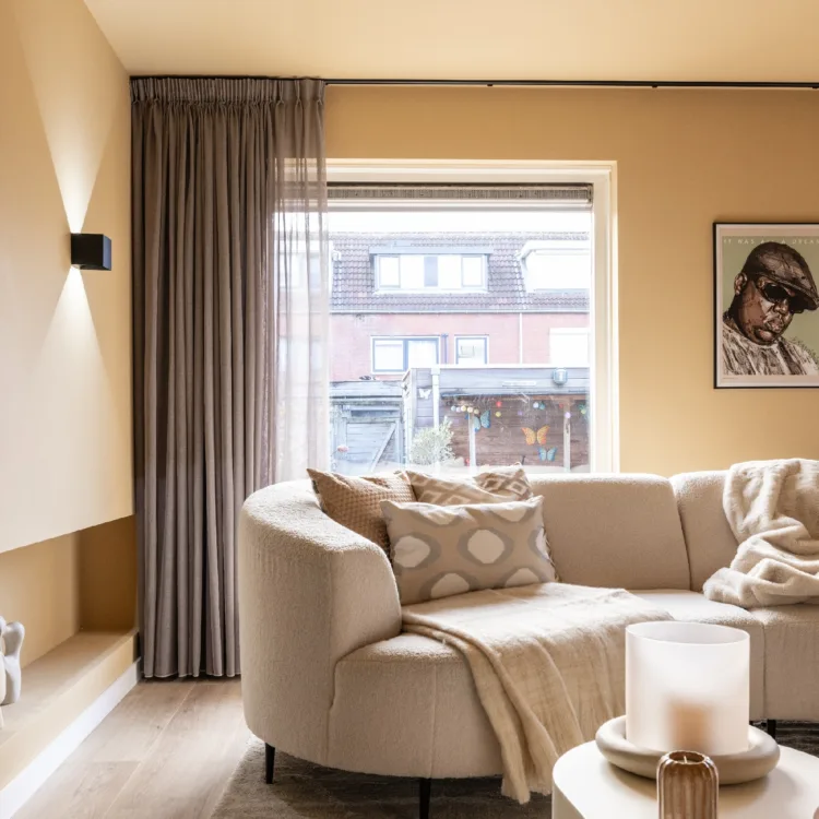 Met zachte kleuren en chique accenten creëerde Britta een harmonieuze sfeer, met gordijnen met een waveplooi, vouwgordijnen en verduisteringsgordijnen uit onze eigen collectie. Het resultaat? Arnoud, Patricia en de drie meiden hebben hun droomhuis gevonden, gewoon op hun oude, vertrouwde plekje. Wil jij dit ook? Schakel onze interieurstylisten in!