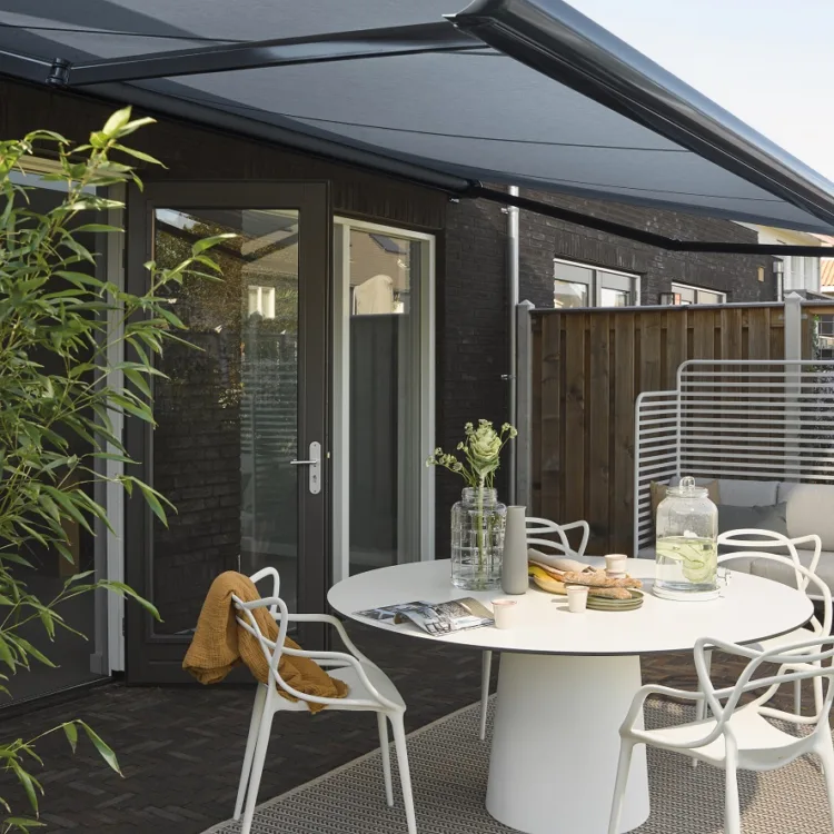 Wil jij de zon weren als je binnen zit, maar óók als je buiten zit? Dan zijn de knikarmschermen zeer geschikt. Niet alleen houden ze de warmte, licht en uv-straling buitenshuis, ook op je terras creëer je een fijne schaduwplek.