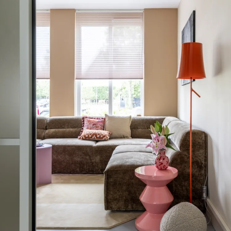 Warmte krijg je gelijk door een houtlook vloer in een donkere tint. Verder ben je goed op weg als je alles in kleur kiest qua woninginrichting. Een vloerkleed met een rood/paarse print, gele dupligordijnen en knalblauwe gordijnen. Op de muren ga je voor bijpassende kleuren en de accessoires houd je rustig.