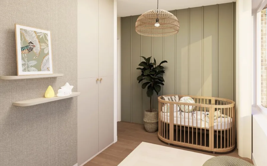 Een prachtige kamer voor het nieuwste gezinslid Isa. Geen standaard roze meisjeskamer, maar een stoere groene muur met heerlijk snoezig oudroze behang. Een stijlvolle en gezellige plek voor de kleine meid om in te dromen. En natuurlijk, zelfs de kleinste dromers verdienen een goede nachtrust – dus ook hier werden de gordijnen van Aanhuis.nl toegevoegd voor die perfecte, donkere slaapomgeving.