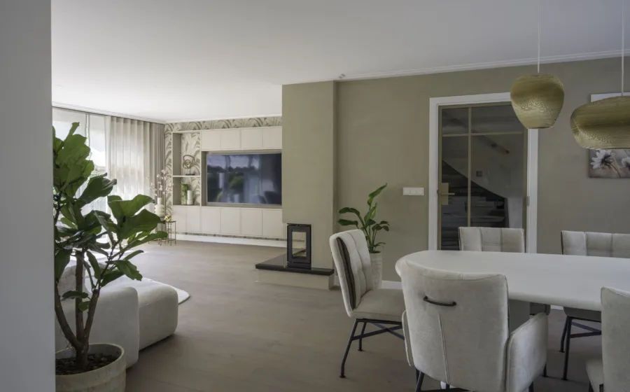 Om dit interieur een nieuwe boost te geven, werd er €26.849 geïnvesteerd. Van moodboard tot montage – elk detail werd volledig voor de bewoners verzorgd! In deze prijs zijn inbegrepen: het opschuren van de eiken vloer, een Cinewall, Arte-behang, QuartzR betonciré op de wanden, Inside-gordijnen en een bronzen metalen deur.