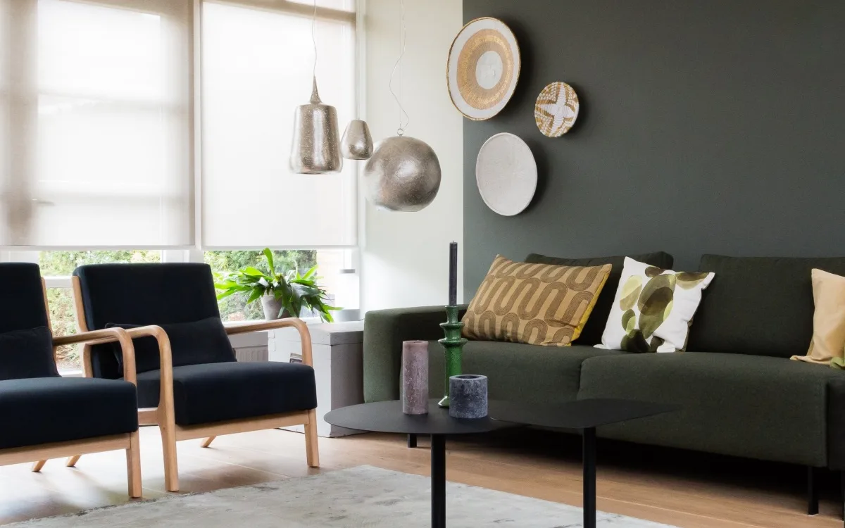 Gewoon simpel, door meer eenheid, rust en functionaliteit in de langwerpige kamer toe te passen. Zo heeft Fietje gekozen voor een mooie groene basis op de muur. Met de bank in dezelfde tint ertegenaan krijg je gelijk rust en eenheid. En die kleur heeft ze in diverse tinten weer terug laten komen. Een combinatie van diverse stijlen, want groen past overal bij en toch met een stoer tintje (oooh die deur, wauw!!)