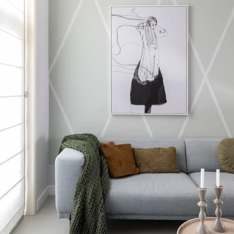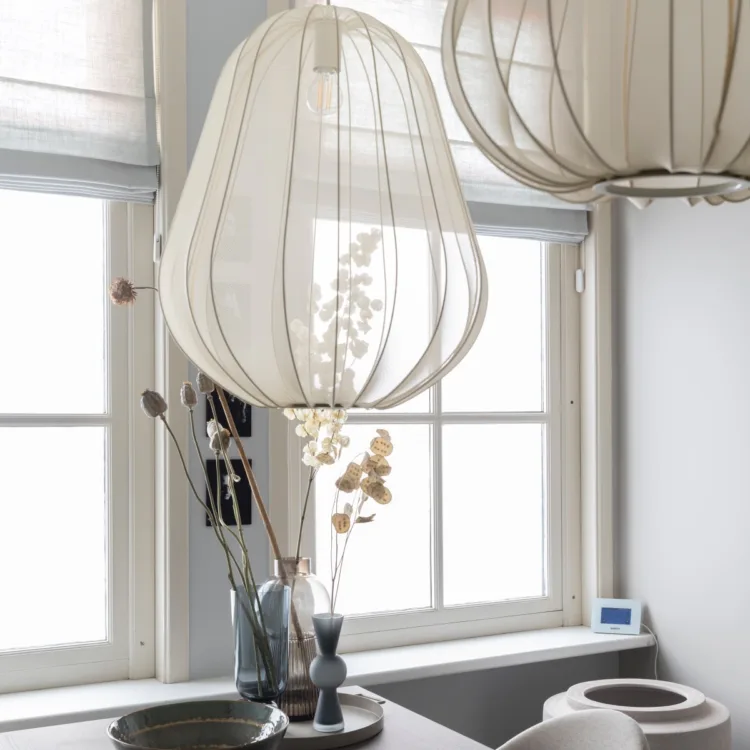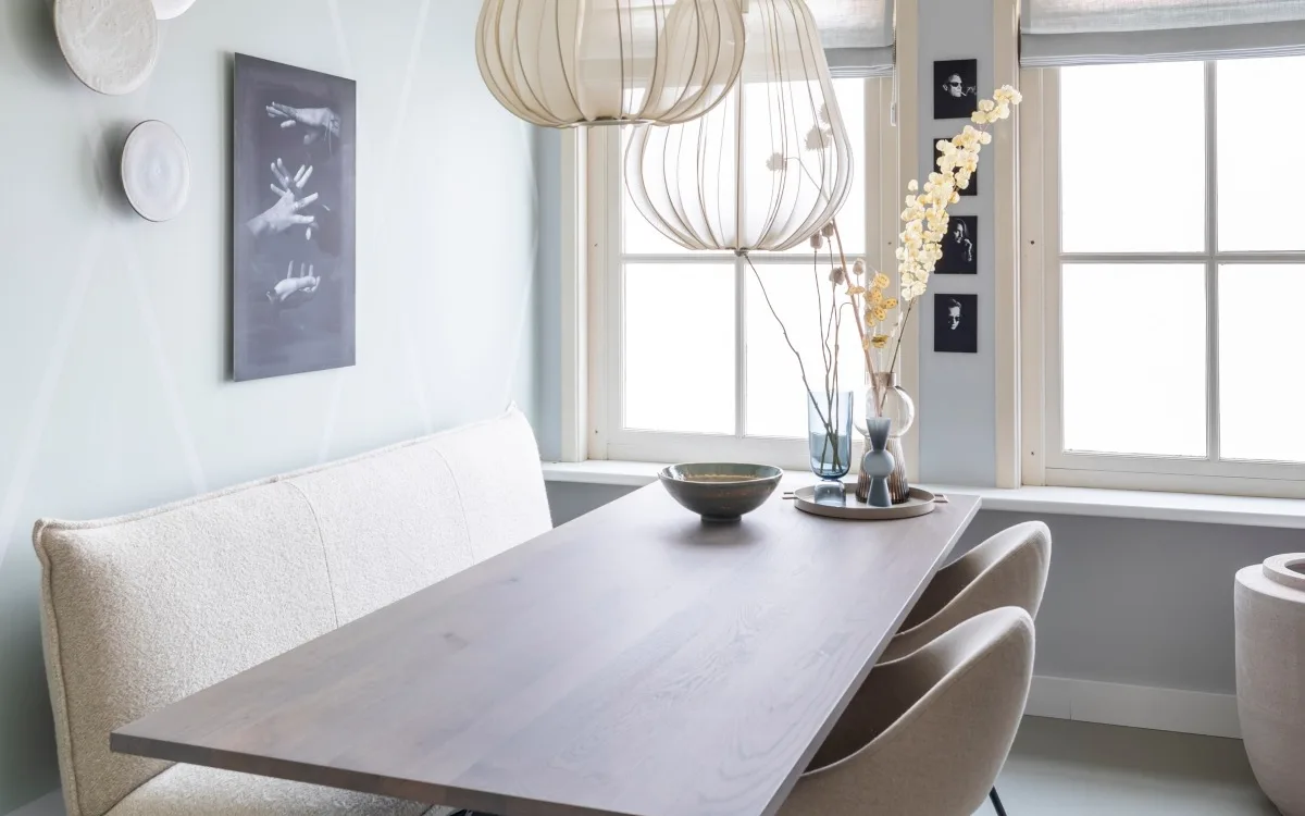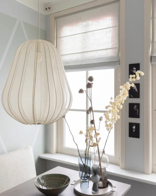 Karin kwam er niet uit als het gaat om raambekleding. Gelukkig weet Marianne er wel raad mee. Ze heeft gekozen voor de licht doorlatende vouwgordijnen van Inside Blinds in de kleur Limbo 50. De rustige kleur past perfect in het pastelkleurige interieur. Doordat er linnen in zit, geeft het een natuurlijke look. En doordat het wel licht door laat, maakt het de kamer ook lichter. Voordeel blijft dat je nog steeds je privacy hebt, want naar binnen kijken bij deze vouwgordijnen zit er niet in. Marianne heeft ze voor en achter laten ophangen voor meer rust en eenheid in de kamer.