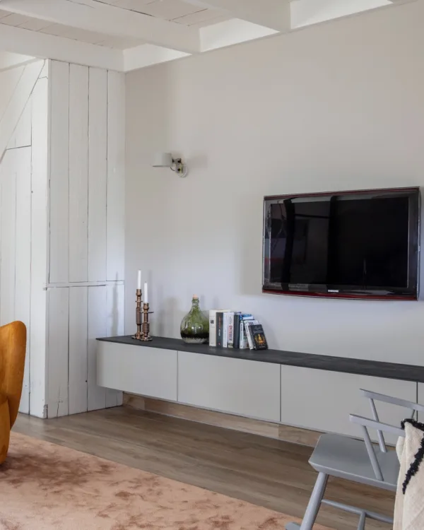 Om ook aan de wens te voldoen van Martijn hebben we samen met Allure een GAAF! kast geplaatst onder de televisie. Een zwevend wandmeubel met een stoer karakter. De GAAF! kast heeft de kleuren Cloud Grey U146 voor de kast. Het toppaneel is van 10 mm dikte (en dat is heel plat) in de kleur Bruciato S171.Het meubel heeft aan de buitenzijde elk een lade en de middelste 2 modules hebben een klepdeur. En om hem nog strakker te maken zijn de lades en deuren greep loos en geleverd met push to open functie.