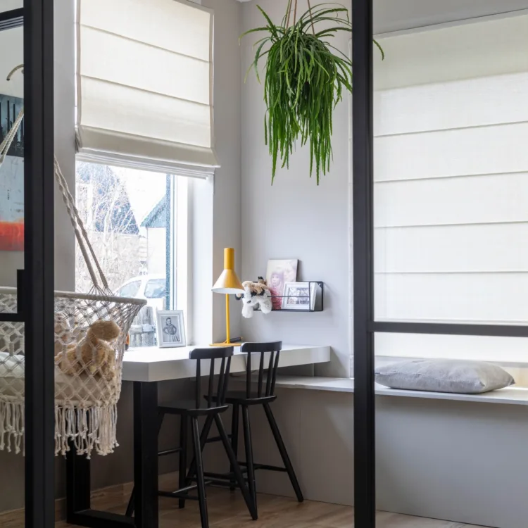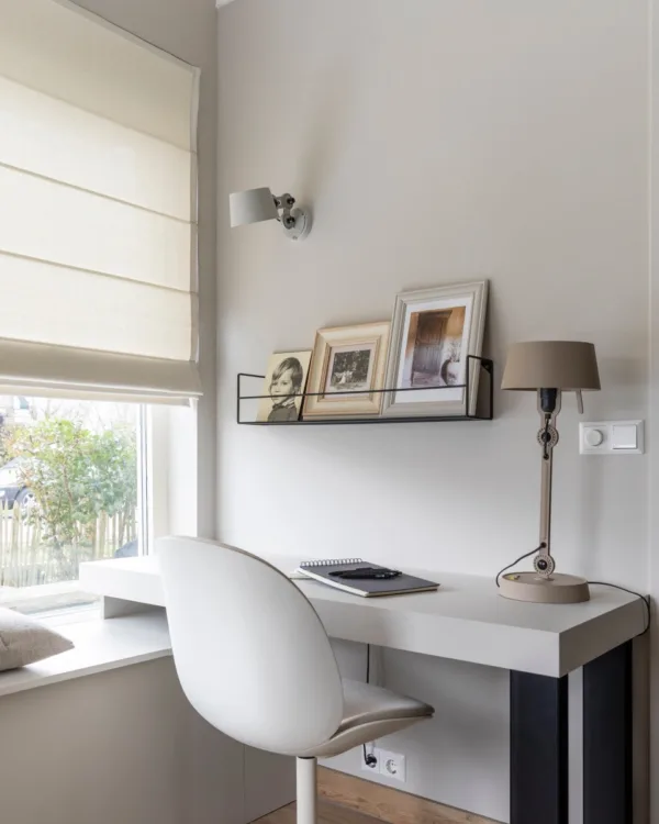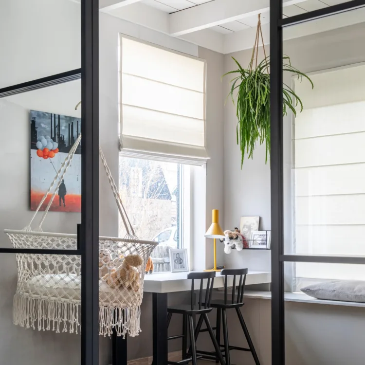 Wist je dat een deel van de sfeer in huis komt door wat je voor de ramen hebt hangen? Carolien is een voorstander van lichte kleuren. Veilig noemt ze het ook wel. Dat is waarom Frans heeft gekozen voor ‘veilige’ vouwgordijnen van de Ploeg (Clipper 01) en gordijnen in dezelfde stof. De vouwgordijnen geven het huis een landelijk sfeertje, wat past bij de brocante voorkeur van Carolien. De vouwgordijnen hangen voor ieder raam op de benedenverdieping voor meer eenheid. Ook bij het stukje waar de kinderen een plek hebben en bij het werkplekje. De gordijnen geven gelijk sfeer aan de woning. En aangezien ze in dezelfde stof zijn als de vouwgordijnen heb je hier ook weer de eenheid.