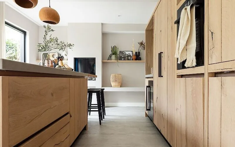 Liza heeft van het hele interieur een plaatje gemaakt. Je ziet veel hout, zeker in de keuken. Ook komen de mooie kleuren waar Wanda zo van houdt goed naar voren. Zie die bank met dat kleed!! Mooie kleur op de muur, stoere meubels en al met al een hele fijne plek om te wonen!