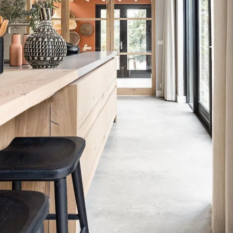 De basis in de vorm van de vloer. Een stoere vloer, een landelijke vloer die zeker zorgt voor het uitgaanspunt om beide stijlen te combineren. Liza heeft gekozen voor de Dynamic Cemento Vinylvloer (kleur 609) van Interfloor. De vloer is niet van een echte betonvloer te onderscheiden. Je ziet geen naden of voegen als bij een tegelvloer en met de banen van maar liefst 4 meter breed zijn de kleine naden amper te vinden. Deze vinylvloer is sterk (geen scheuren), makkelijk in onderhoud, hard en toch comfortabel én geschikt voor vloerverwarming. Het is allesbehalve een kwetsbare vloer, je zult dus niet snel krassen gaan krijgen en zien.