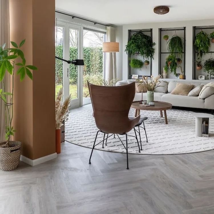 Door hout met hout te combineren creëert Frans een spannend geheel en voldoet daarbij aan de wens voor lichte én donkere houttinten in huis te gebruiken. Met een prachtige, warme pvc vloer als basis!