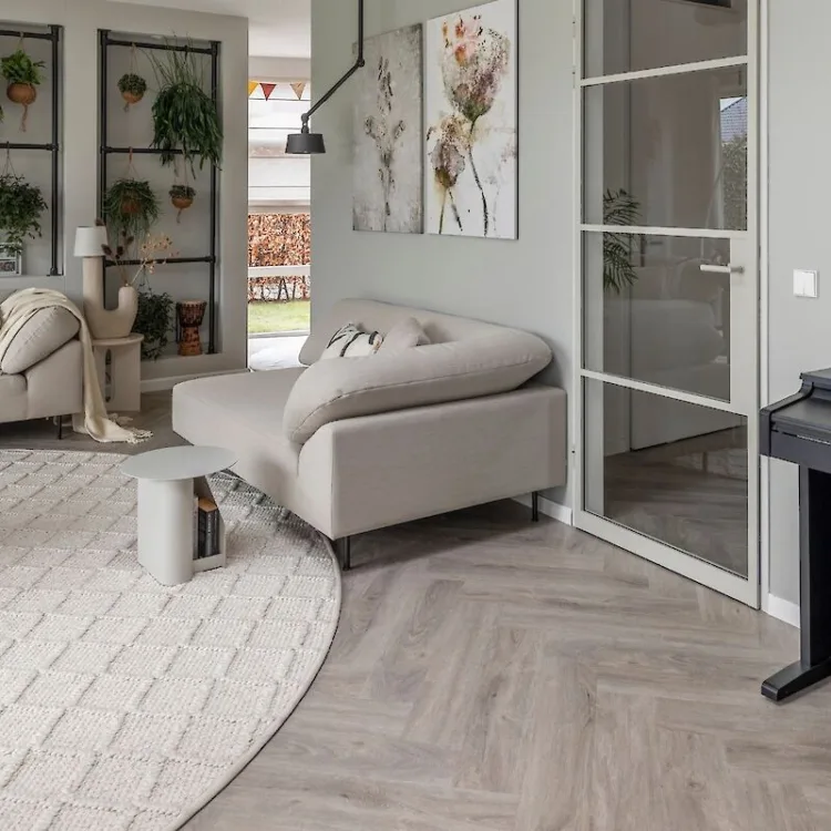 De oude vloer gaat eruit en er komt een nieuwe frisse vloer voor in de plaats, met vloerverwarming! Frans kiest hierbij voor de zachtgrijze pvc vloer Malgas C4450 uit de Aanhuis collectie in visgraatpatroon. Deze kleur ligt precies in het midden van de wensen van Daniël en Ryani waardoor er een perfect mix van hun smaken ontstaat.