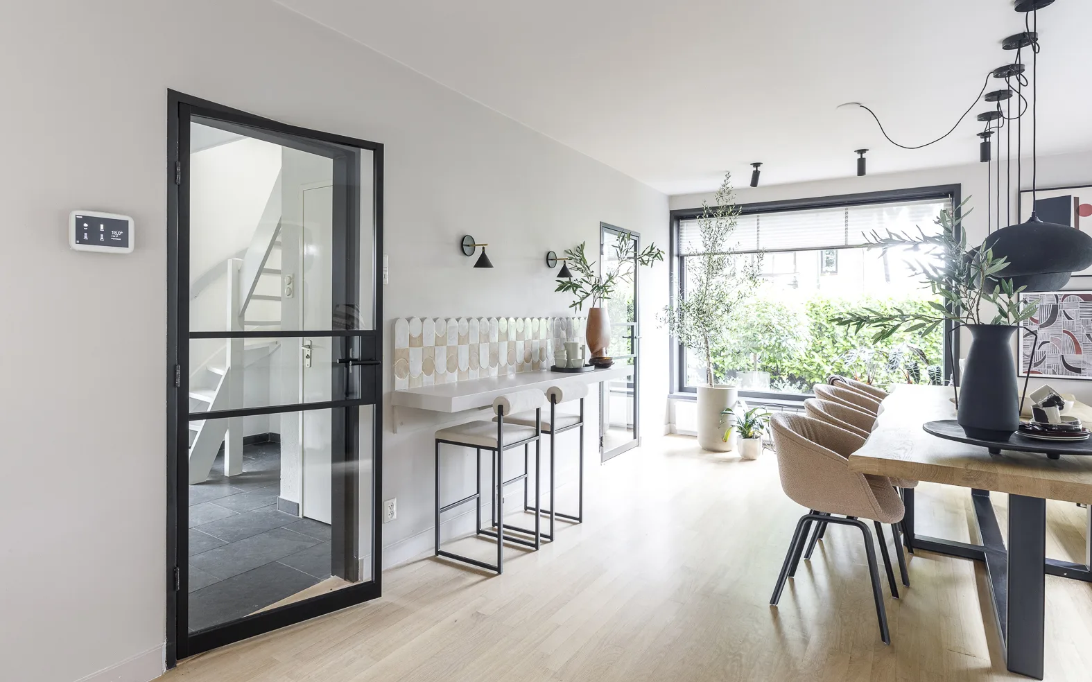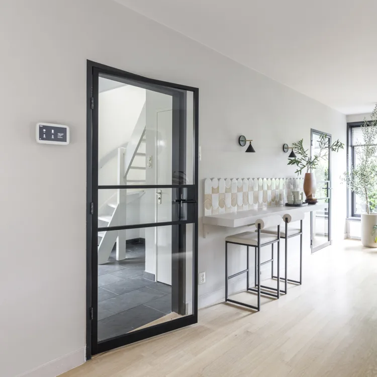 Zoek je een echte wow factor in je interieur? Bekijk dan onze stalen deuren eens goed. Heb je echt voldoende ruimte, ga dan voor stalen taatsdeuren; dat geeft een groots effect in je huis! Dubbele deuren die beide kanten open kunnen; wie wil dat nou niet? Ook zoals in Soest doet een stompe stalen deur ook al wonderen. Je verbindt perfect ruimten aan elkaar, behoudt voldoende licht en het voldoet aan zowel de industriële wensen van Daan als de modern, strakke wens van Milica. Geweldig effect krijg je wanneer je de andere kozijnen in dezelfde kleur maakt. Zwart in dit geval. Stalen deuren zijn er overigens ook in het wit en brons.