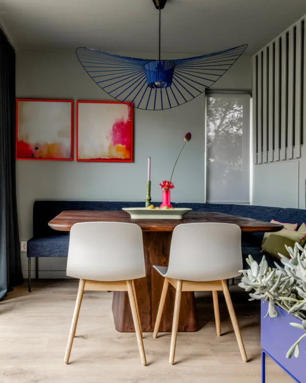 Het interieur heeft de perfecte balans gevonden tussen de twee smaken binnen de Warm kleurrijk woonstijl! Dankzij Kelly’s oog voor harmonie en kleur straalt de ruimte een stoere vibe uit die Shelley te gek vindt, maar behoudt het ook de rust en kalmte voor Boaz.
