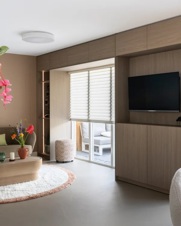 En wat maakt zo’n prachtig interieur nu écht af? Juist, stijlvolle Luxaflex® wavegordijnen! Kelly koos voor een prachtige De Ploeg-stof in de kleur Hollow 69: een stijlvolle zandtint die moeiteloos aansluit bij de aardetinten op de muren.